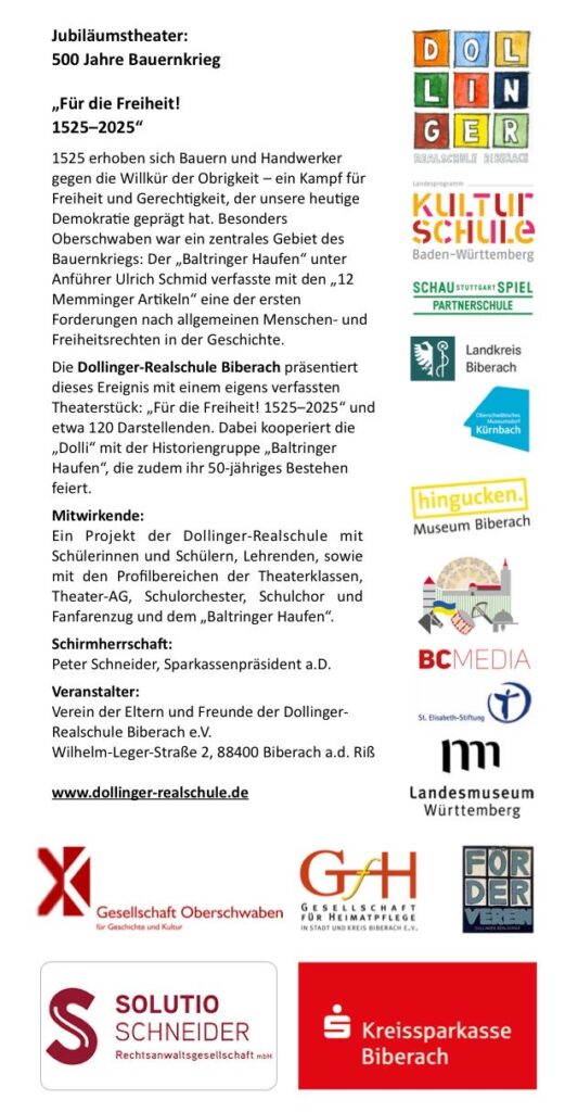 Vom 15. bis 25. Mai 2025 wurde die Geschichte des Bauernkriegs in Oberschwaben lebendig – und ich war mittendrin! Als Tontechniker für das Theaterprojekt der Dollinger Realschule hatte ich die spannende Aufgabe, Chor, Orchester und Schauspieler*innen perfekt zu verstärken, und das über mehrere historische Spielstätten hinweg.